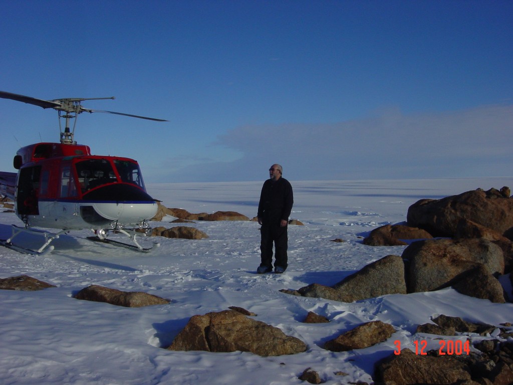 Photograph of helicopter coming in to land at Conway Ridge, Antarctica, 2004, original in private collection.