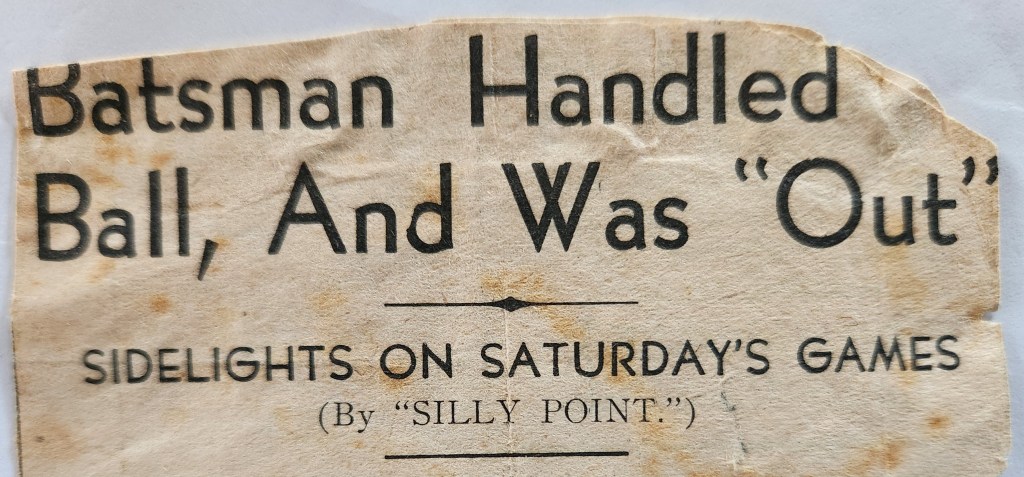 ‘Batsman Handled Ball, And Was “Out”‘, Central Western Daily, November 1945, page unknown, held in private collection.
