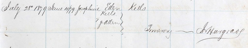 So the birth registration says Ellen’s child was a boy named Joseph Feehan Kells, and is officially indexed that way. However, all other records are to the contrary. In fact, just two months later, a record of baptism gives the same date of birth, 4 June 1879, and has Josephine’s name correct, although her mother’s name is rather poorly recorded along with a question mark. Perhaps her Irish accent was again a barrier to accurate recordkeeping.