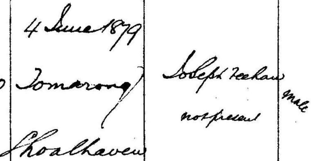 One of the witnesses to Josephine’s marriage is her half-brother Robert, my 2x great-grandfather who was almost 20-years-old when his sister was born. On the marriage registration his sister’s age is given as 21 and her birthplace as Tomerong, both of which match the information on the birth record for Joseph Feehan Kells.