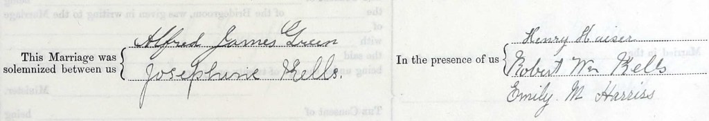 Marriage certificate of Josephine Kells and Alfred James Green, married 17 October 1900, Registry of Births, Deaths and Marriages, New South Wales, 9340/1900.