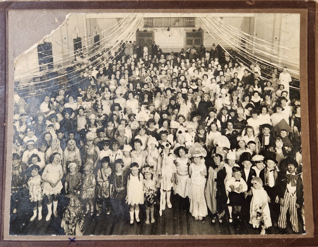 I love this photo, a large group shot taken at Manresa Hall in Carlow Street, North Sydney in the mid-1920s. Around 200 people are present, with the children all in fancy dress. My grandfather is one of the youngest and dressed as a ‘spring chicken’. You can see him at the bottom left of the picture, in front of everyone else, with a cheeky expression partly hidden by the feathers. Look closely at all the different costumes in the photo, which is almost 100 years old, and try working out what they are. It’s easy to imagine it must have been a fun party!