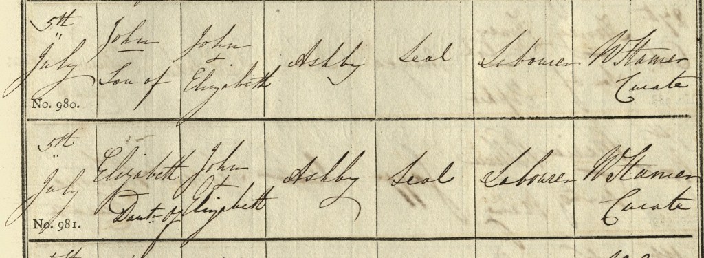 Twins born to John and Elizabeth Ashby were my 3x great-grandfather John and his sister Elizabeth. They were born in Seal, Kent in 1835, but baby Elizabeth died at the age of “5 months & 1 fortnight”. As an adult in his early twenties, John emigrated to Australia where he had a family. John died in his thirties.