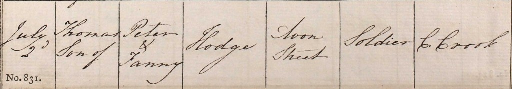 Knowing that Peter Hodge senior’s militia career meant he and Fanny were not always in the same place for very long, and having found Abraham and Elizabeth as born in Kent and Sussex, I was confident in widening my search and found another child born to Peter and Fanny. This was another son, one named Peter who was recorded under the heading “Baptisms from the Barracks” in East Blatchington, Sussex on 4 January 1807.
