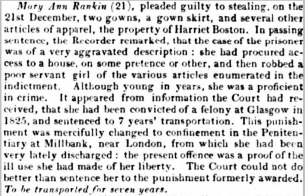 The second conviction was for stealing “wearing apparel” and passing it on to the woman with whom she lodged. This conviction resulted in a sentence of transportation for seven years, one that that wasn’t commuted, and the newspaper report didn’t paint her in a good light. I suspect Mary’s circumstances were dire, both in Glasgow several years earlier, and following her release from prison, and that theft was a means to survive.