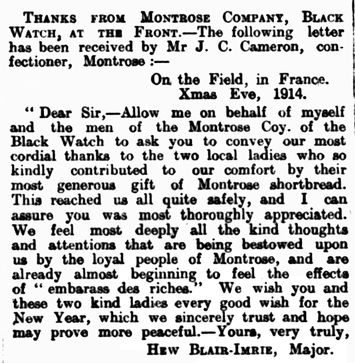 ‘Thanks from the Montrose Company, Black Watch, at the Front’, Montrose Review, 1 January 1915, p. 5.