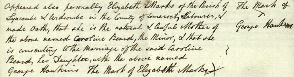My 4x great-grandparents George Hawkins and Caroline Beard were married by licence in Bath Abbey in May 1815. The licence record includes a sworn statement there was no barrier to the marriage, and a commitment by George in the form of a bond which meant he would forfeit 200 pounds if the marriage didn’t proceed. That’s a lot of money!