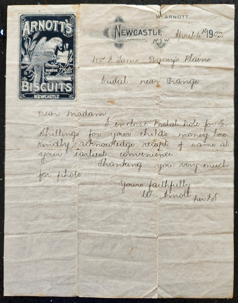 Born in 1901, she was known to her family as Noela. The thing about the photo is that it earned her ten shillings. That’s the equivalent of about $80 to $100 today. I have both the framed photo, and the letter Catherine Toms, nee Moss, my 2x great-grandmother, received. It’s written on official Arnott’s stationery, and dated 4 April 1902.