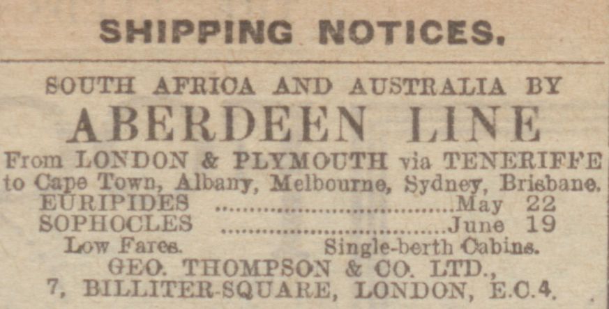 Ritchie: The most recent of my migrant ancestors are my grandmother Margaret, great-grandmother Connie and her two brothers, and my 2x great-grandparents David and Margaret Ritchie. They left the UK on 22 May 1924 on the Aberdeen Line‘s Euripides.