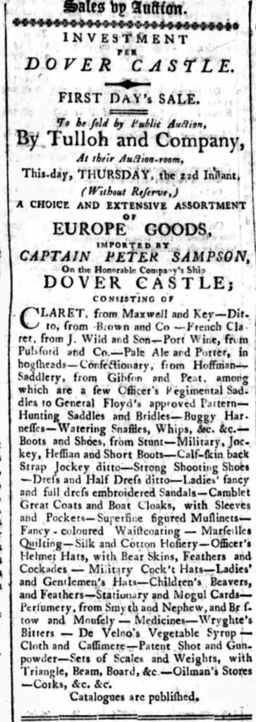 ‘Sales by Auction. Investment per Dover Castle.’, Calcutta Gazette, 22 October 1801, p. 12.