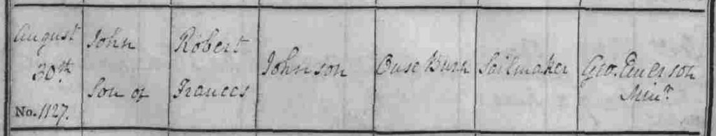 The date matches with John’s age being 37 when he died. His parents’ names are given as Robert and Frances, which are the names of John’s first two children. Perhaps that’s a coincidence, but it’s likely the children were named after their grandparents. And his father’s occupation is recorded as sail maker, just like John.