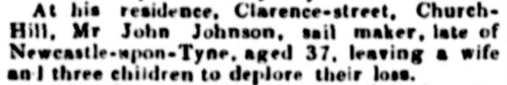 In a report of John Johnson’s death, just eight years after he married, Newcastle Upon Tyne is mentioned again, as is Clarence Street as where he was living in Sydney. It also says he was a sail maker, the same as his father-in-law, William Thurgate—perhaps they worked together in Sydney.