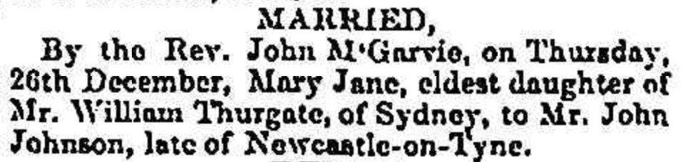 John married Mary Jane Thurgate in Sydney in December 1844. A newspaper report of their marriage gave the first clue about where he was originally from—Newcastle Upon Tyne.